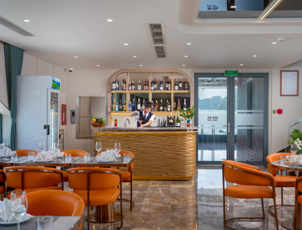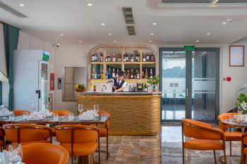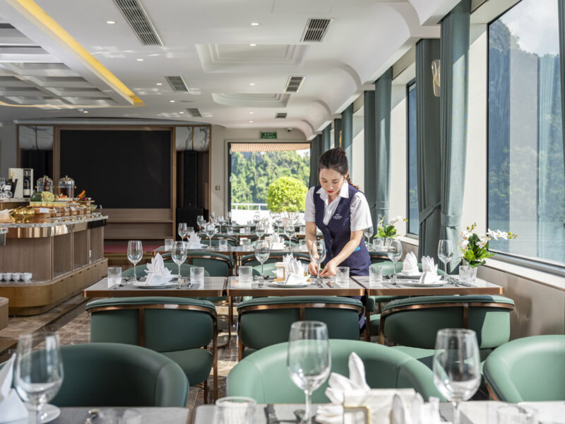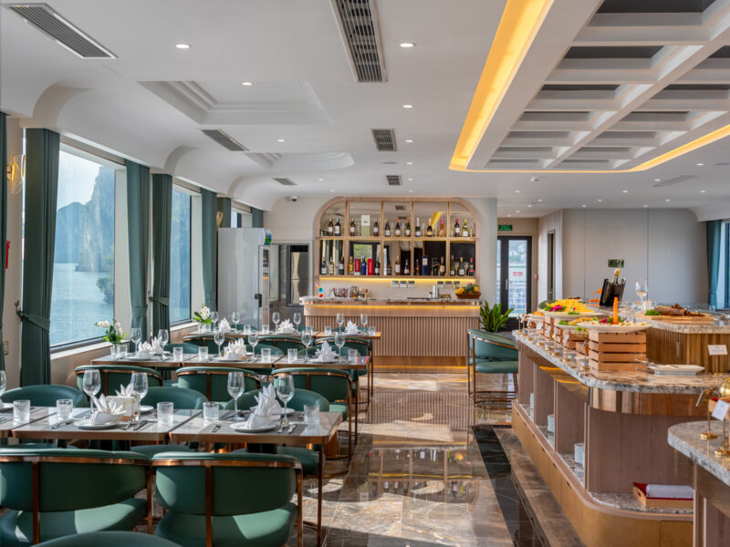 In addition, dining onboard Leona Cruise is a refined experience in itself. The elegant restaurant and bar serve gourmet Vietnamese and international cuisine, along with signature cocktails, all enjoyed against the stunning backdrop of Ha Long Bay. Guests can savor high-quality dishes while relaxing in a luxurious and stylish setting.