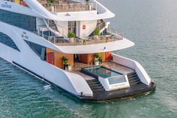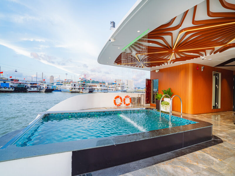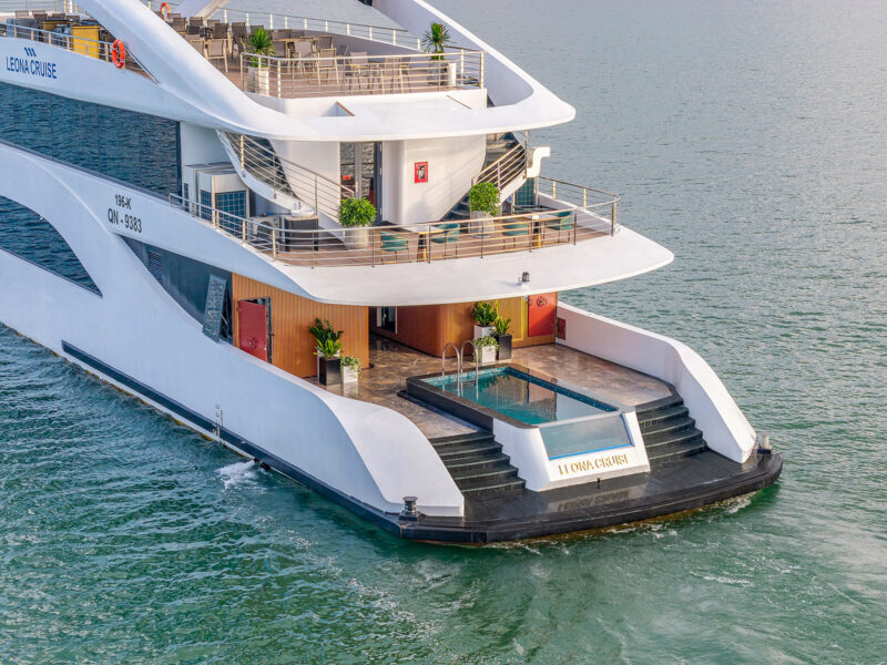 First of all, Leona Cruise stands out with its modern, high-end design and world-class facilities. Featuring a spacious sundeck, infinity pool, and panoramic views, the cruise allows guests to fully immerse themselves in the breathtaking limestone landscapes and emerald waters of Ha Long Bay while enjoying ultimate comfort.
