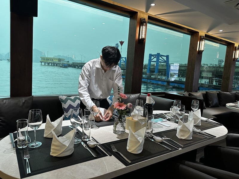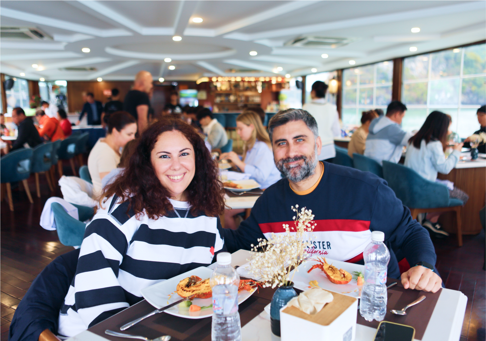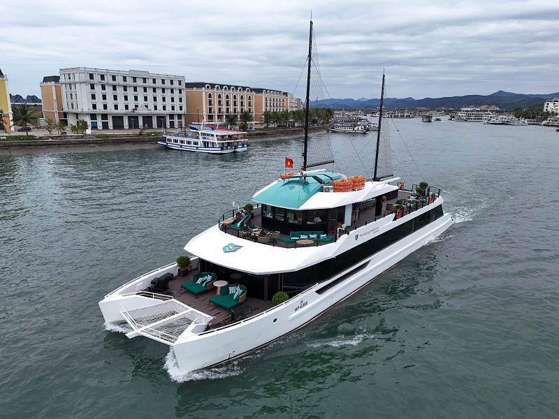 Moreover, onboard dining is a highlight of The Catamaran Premium Cruise. Guests are served a refined lunch featuring Vietnamese specialties and international cuisine, prepared with fresh, high-quality ingredients. The elegant restaurant setting, combined with stunning bay views, creates a truly memorable dining experience.
